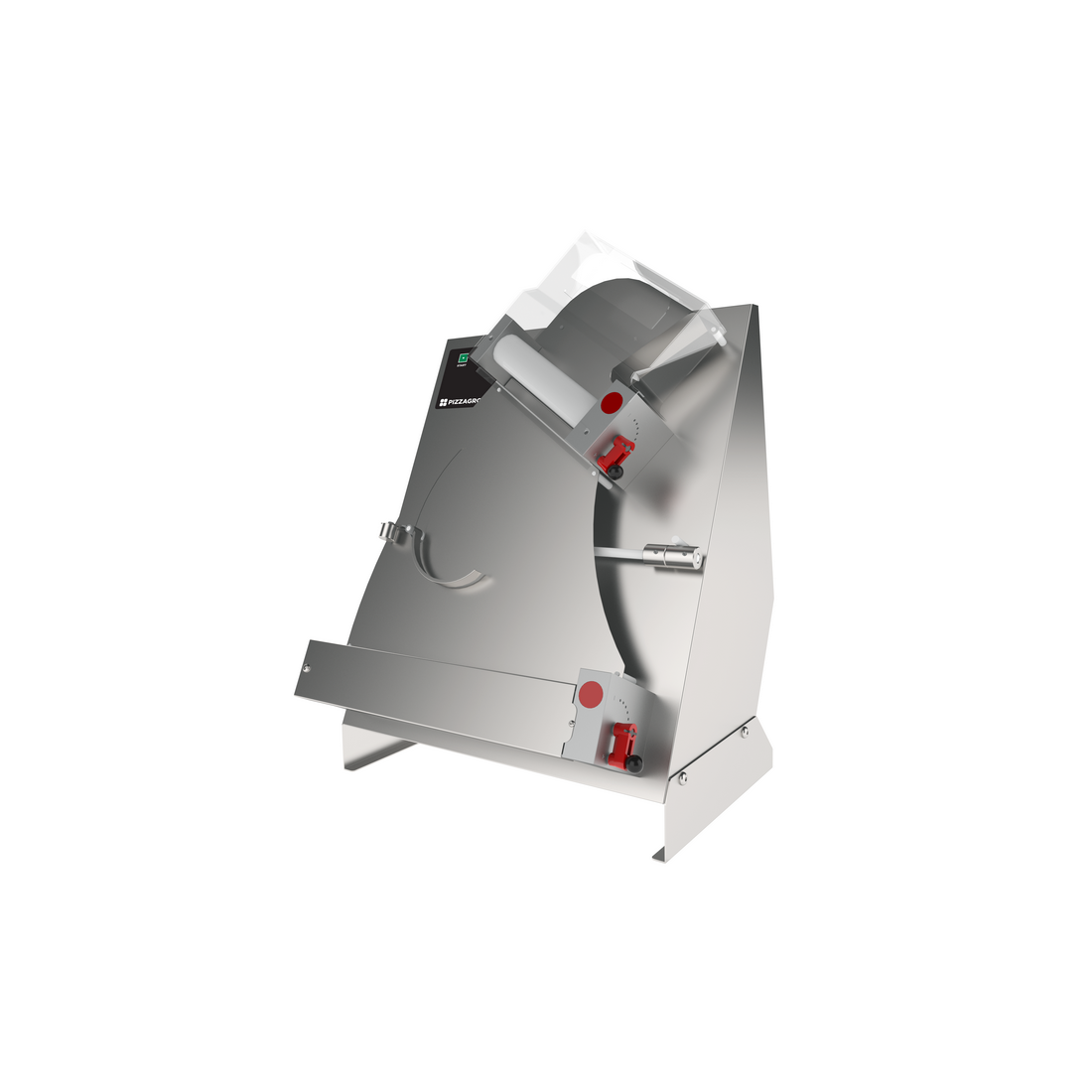 Formadora de masas de pizza para diámetros de 260 a 400mm, con dos rodillos de resina alimentaria. Está fabricada en acero inoxidable, su potencia es: 370W. Modelo de Fabricación Italiana. Pedal incluido.
