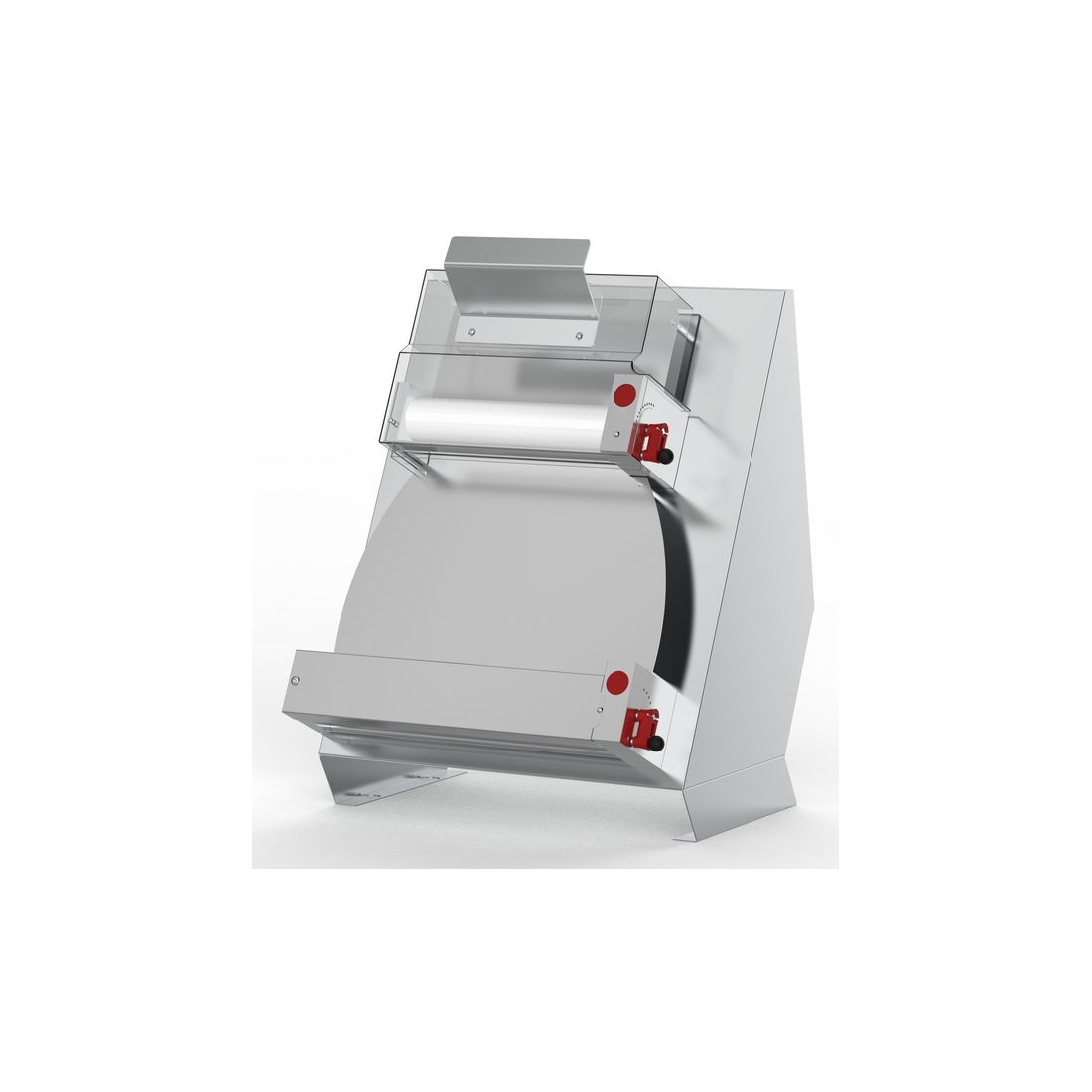 Formadora de masas de pizza para diámetros de 260 a 400mm, con dos rodillos de resina alimentaria. Está fabricada en acero inoxidable, su potencia es: 370W. Modelo de Fabricación Italiana. Rodillos alineados. Pedal incluido.