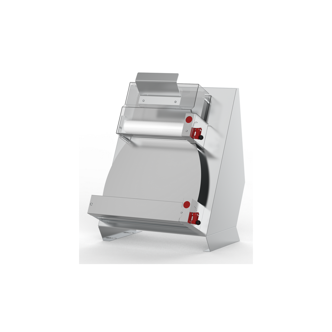 Formadora de masas de pizza para diámetros de 300 a 430mm, con dos rodillos de resina alimentaria. Está fabricada en acero inoxidable, su potencia es: 370W. Modelo de Fabricación Italiana. Rodillos alineados. Pedal incluido.