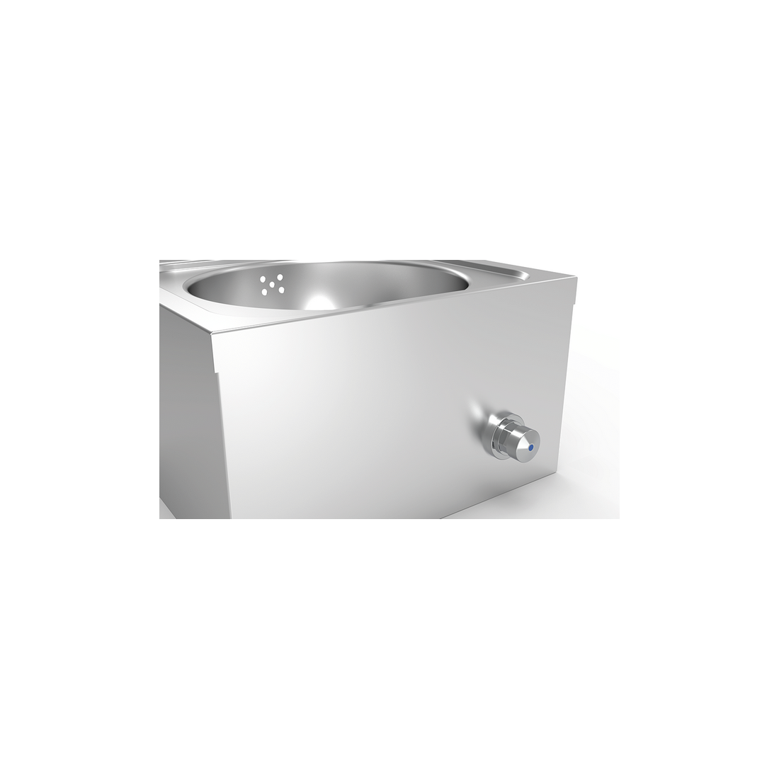 - Cubeta de alto espesor embutida en una sola pieza, con esquinas redondeadas, reborde antiderrames y rebosadero.