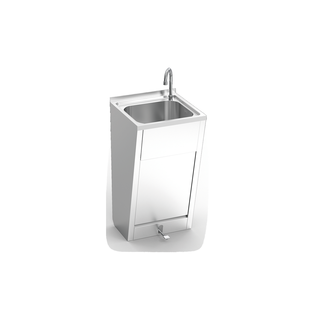 Lavamanos registrable con Pedal de Fricosmos, está construido completamente en acero inoxidable, equipado con grifo giratorio y pedal de agua fría y caliente.
