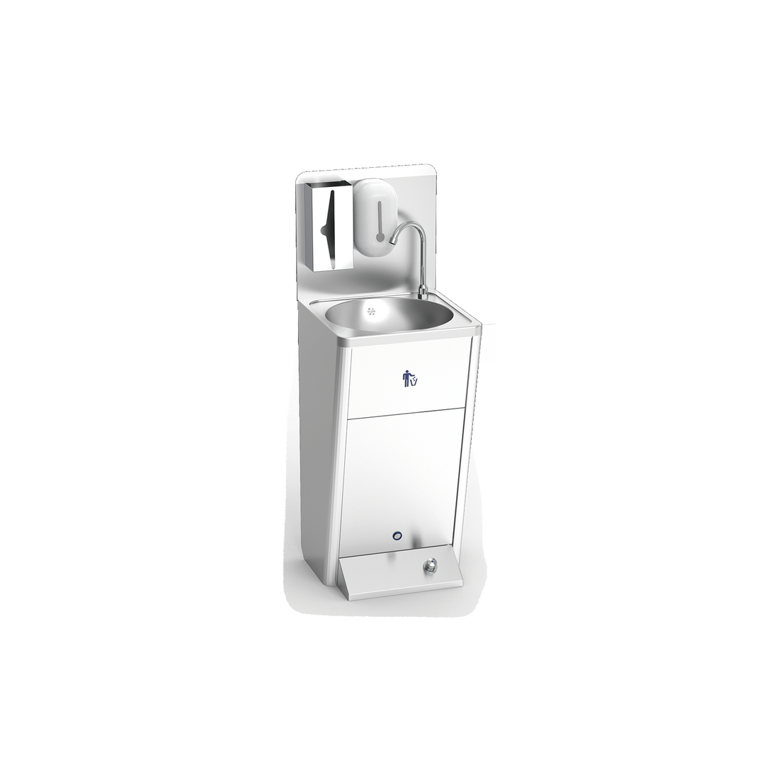 Lavamanos mural completo con pulsador de agua fría / caliente. Incluye: papelera, dispensadores de jabón y toallas, peto trasero y grifo giratorio.