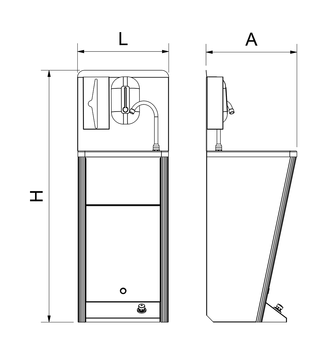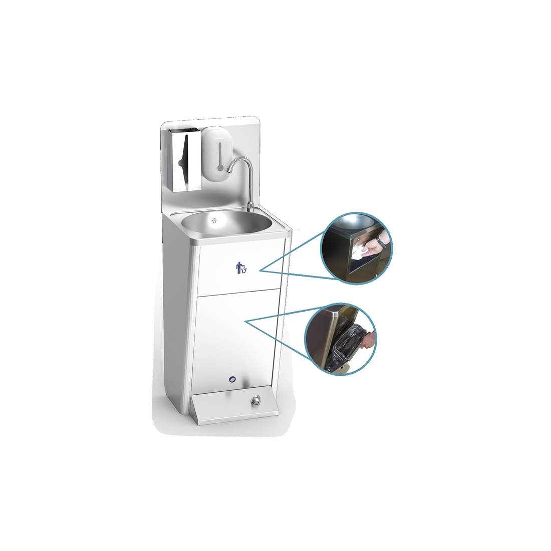 - Dotación de serie: Lavamanos completo, papelera integrada en el mueble, peto trasero, dispensador de toallas en acero inoxidable, dispensador de jabón con capacidad de 1 litro.
