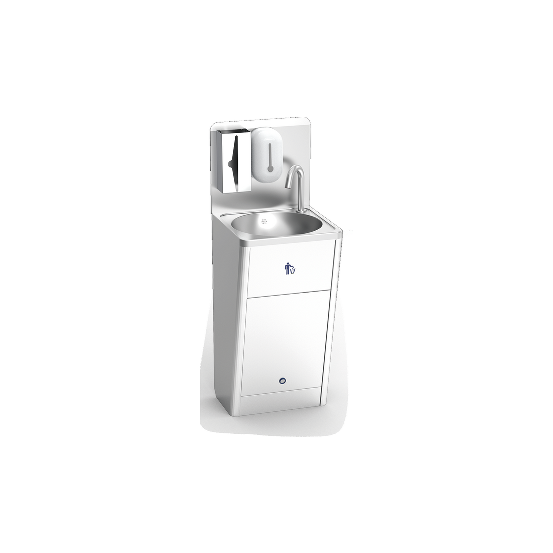 Lavamanos mural completo con funcionamiento a pilas. Posibilidad de agua fría y caliente. Incluye: papelera, dispensadores de jabón y toallas, peto trasero y grifo giratorio.