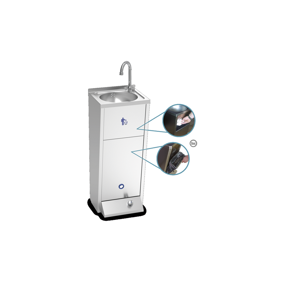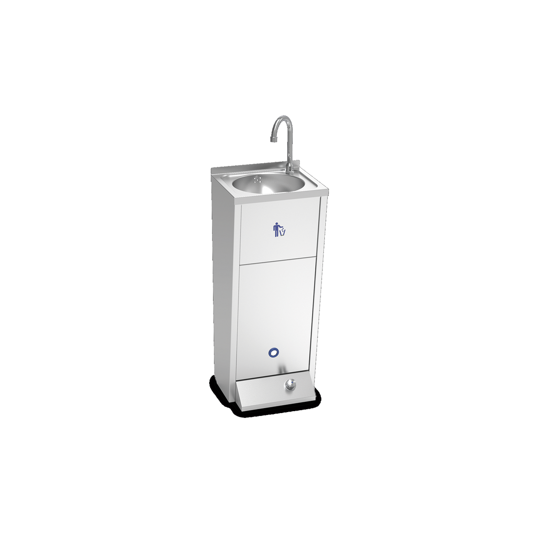 Lavamanos de Pulsador Estrecho Fricosmos, está construido completamente en acero inoxidable, equipado con: grifo giratorio, pulsador y papelera.
