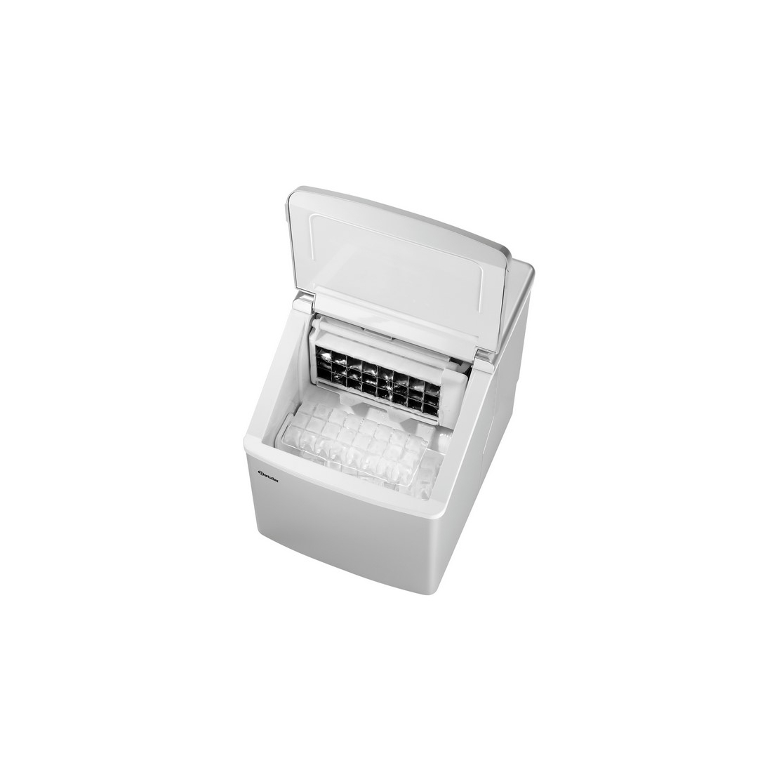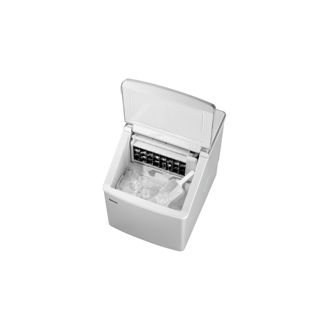Maquina de hielo para pequeñas producciones con almacen de 1 Kg de capacidad (360 cubitos). Tiene una producción máxima de 15 Kg cada 24 horas. ¡Incluye pala para cubitos de hielo! Potencia: 0,24Kw. Dimensiones externas: 280 x 380 x 345mm