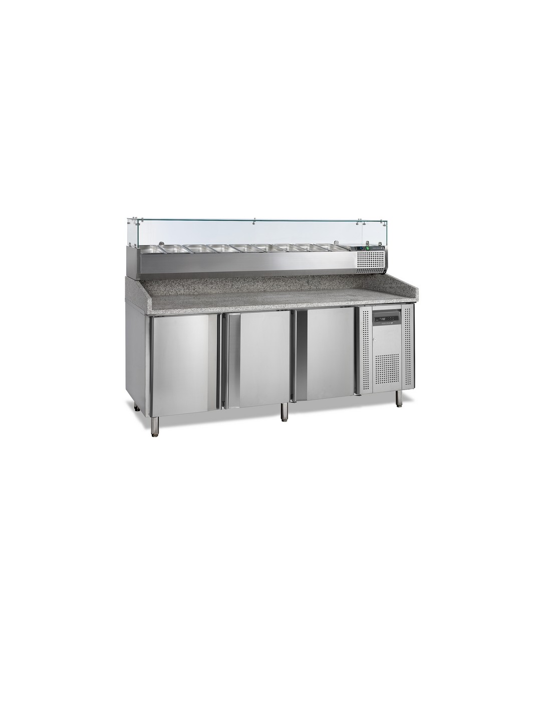 Mesa de preparación de pizzas de 2 metros con encimera de granito, capacidad para 21 bandejas de pizza 400x600 mm y unidad de condimentos GN 1/3. Refrigeración de tiro forzado y control electrónico. Medidas externas: 2045 x 800 x 1445mm. Rango de temperatura: +2/+10ºC. Con vitrina de ingredientes incluida. Modelo de bajo consumo.