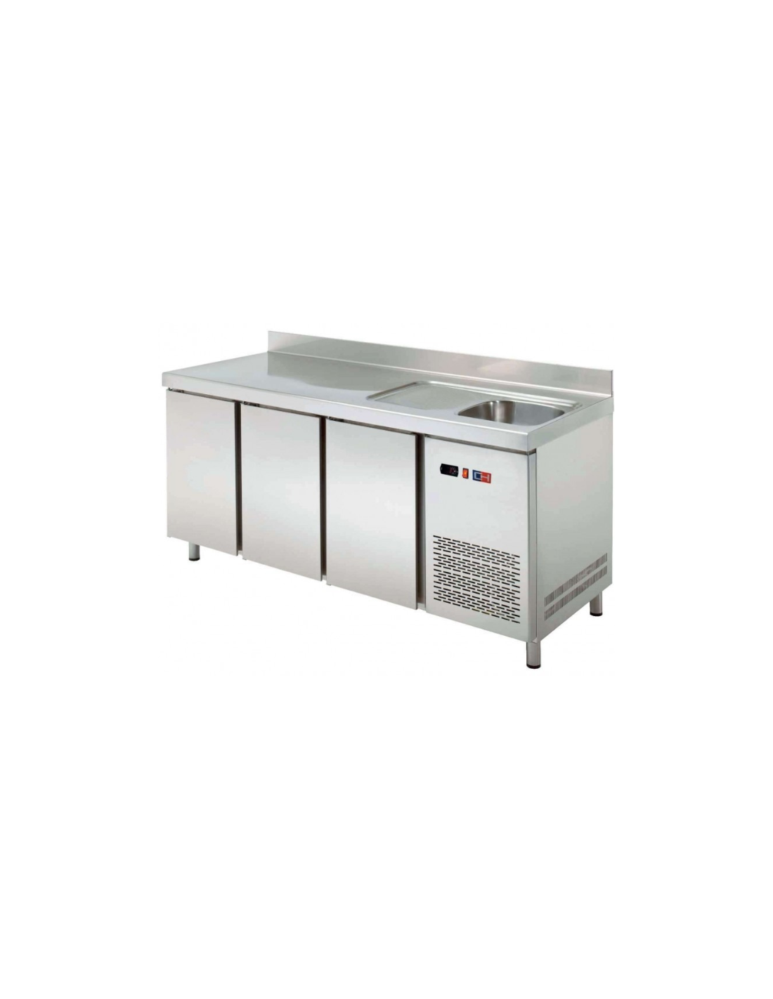 Mesa refrigerada con fregadero, 390 L de capacidad y tres puertas. Temperatura 2 a +8 °C, potencia 220 W, consumo 1118 kWh/año. Fregadero integrado, acero AISI 304, control digital. Medidas: 201,7 × 60 × 85 cm. Tensión: 230 V.