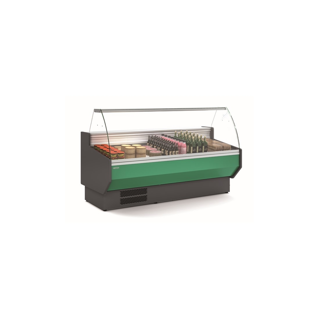 Vitrina de charcutería con unas dimensiones de 2465 x 940 x 1235 milímetros. Equipada con una superficie de exposición de 640 milímetros. Incluye 4 puertas traseras de reserva para el almacenamiento con una capacidad de 759 litros. Refrigeración de alto rendimiento, con consumo energético reducido. Diseñada con tipo de cristal curvo.
