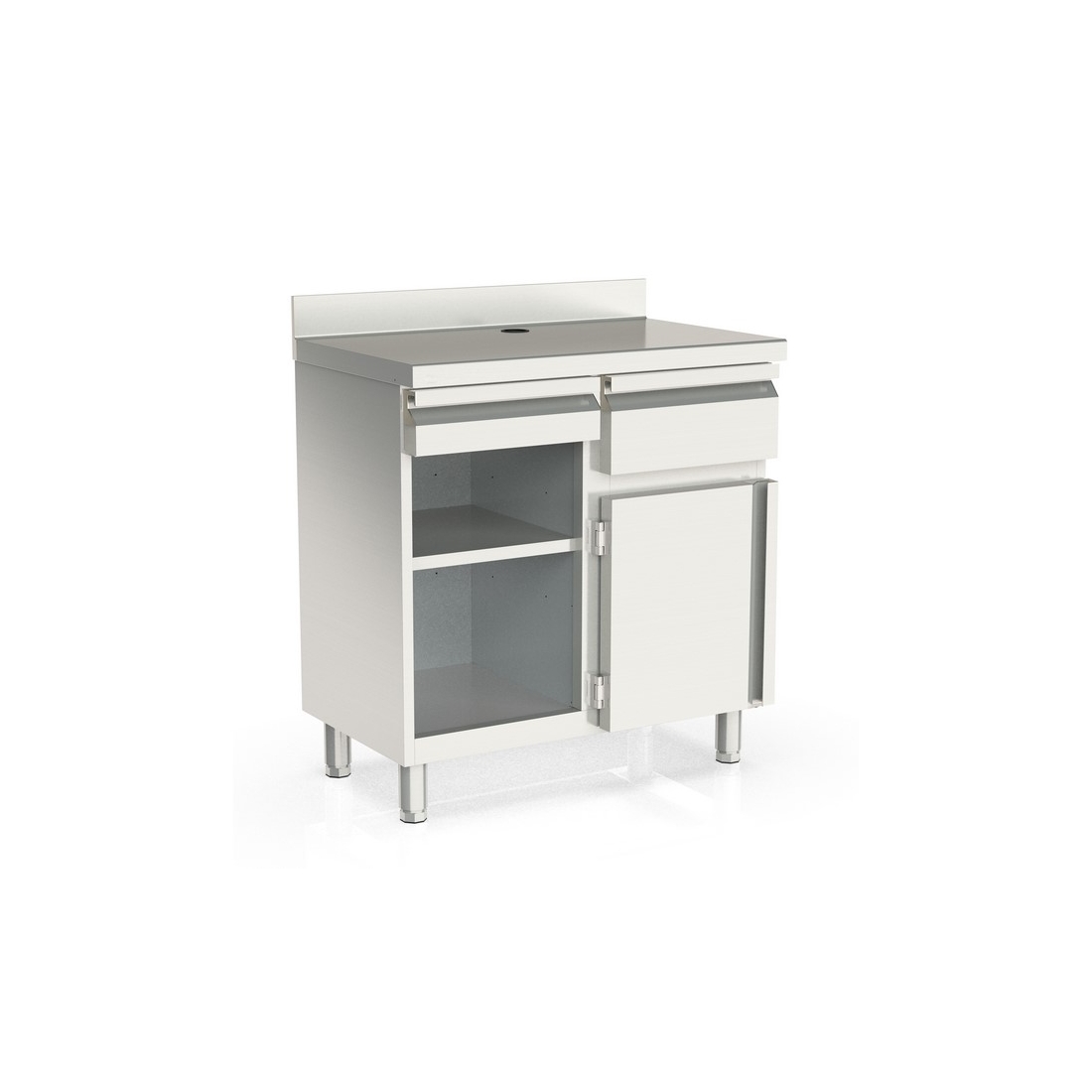 Mesa cafetera elegante construida en acero inoxidable y respaldo en acero plastificado. Medidas 1000 x 600 x 1040 mm. Incorpora 1 cajón, 1 estante y cajón tolva para café. Pesa 66kg. Personalizable en dimensiones bajo pedido.