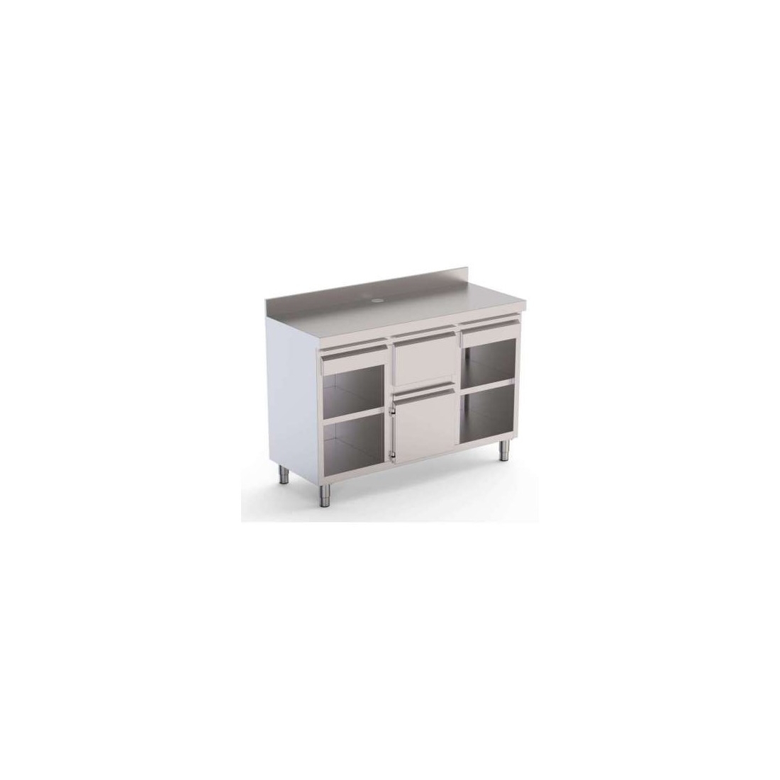 Mueble cafetero mural, con cajón, puerta y estante, construido en acero inoxidable de alta calidad AISI-304, con patas en tubos de 40x40mm, regulables en altura 1050-1100mm. Medidas: 2500 x 600 x 1050 mm.