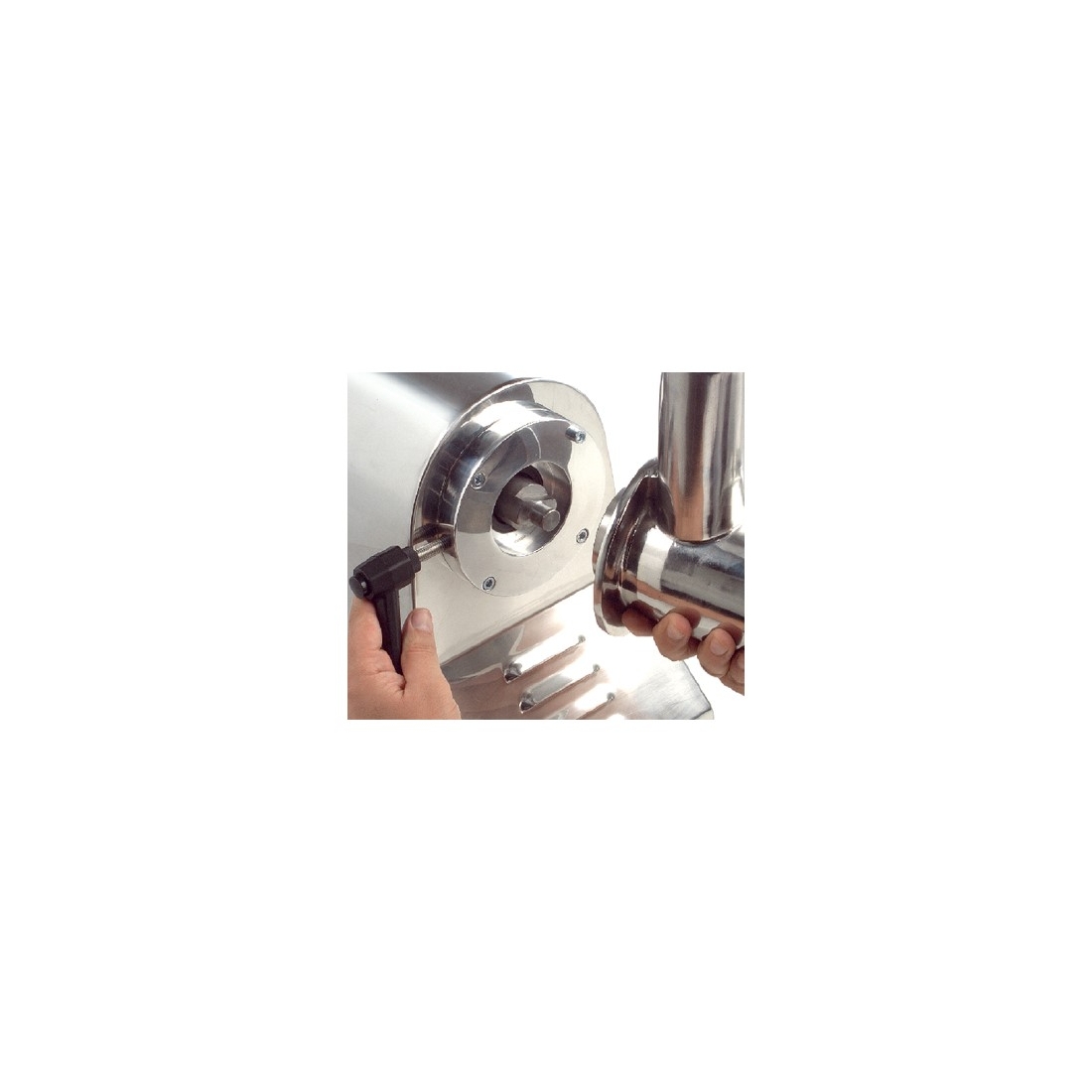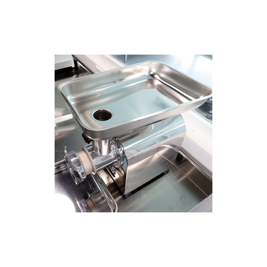 Picadora de carne industrial con boca de 12mm. Tiene una capacidad de producción de hasta 200 Kg/hora y cuenta con una potencia de 750W. Todas las piezas en contacto con el alimento están fabricadas en acero inoxidable.