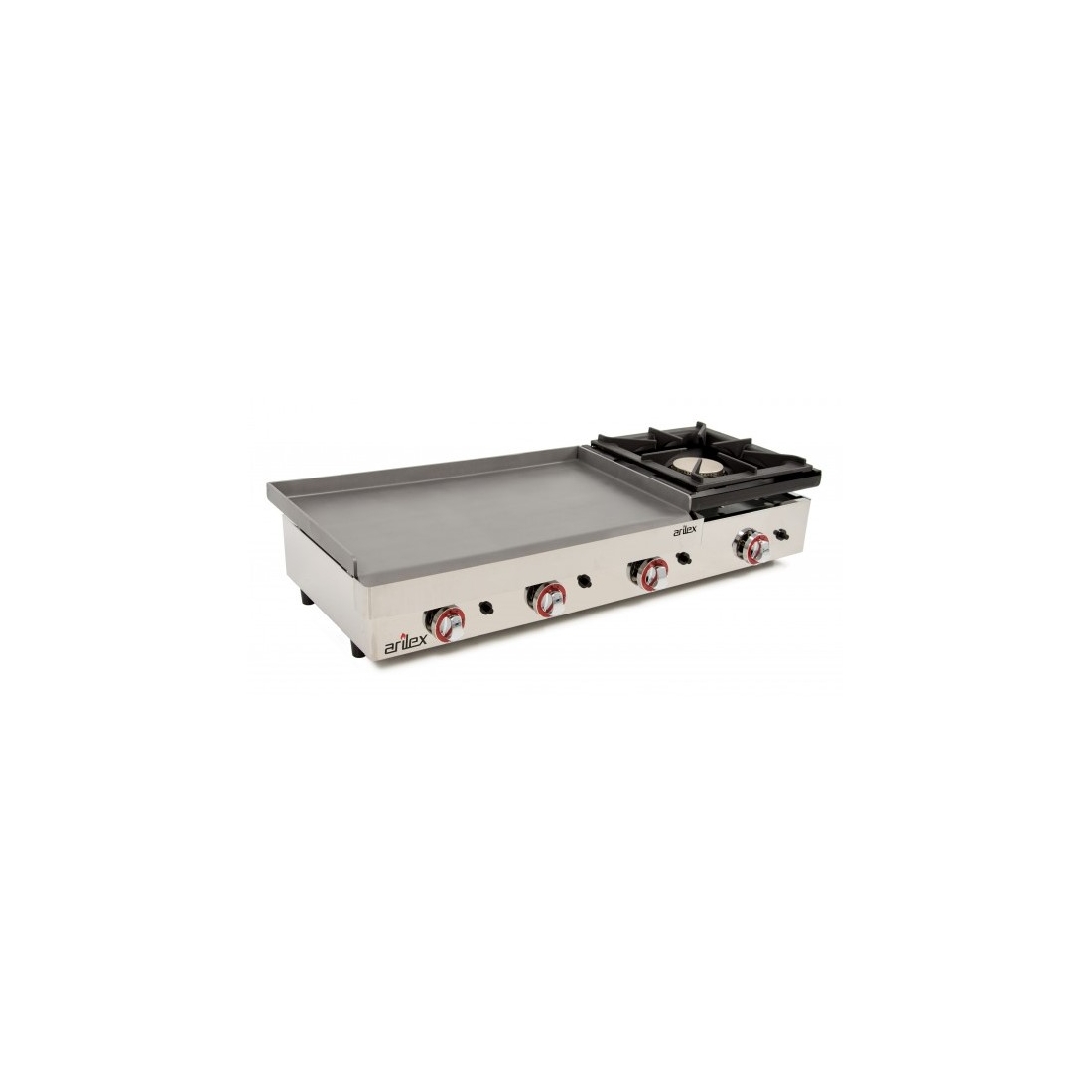 Plancha industrial acero laminado 120PGLF de Arilex, construida en acero inoxidable acabado brillo con un fogón a gas.