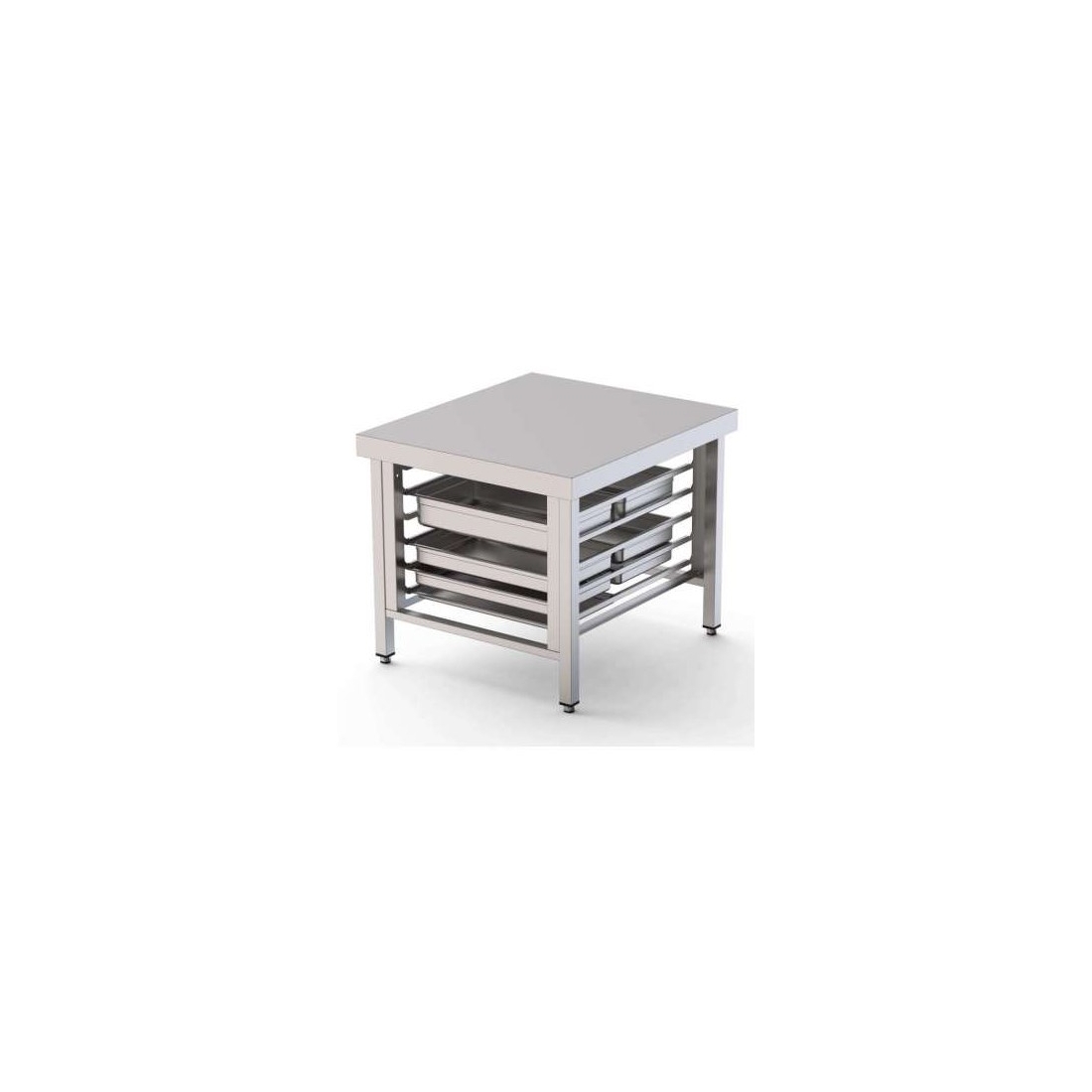 Mesa de soporte para hornos. Cuenta con una capacidad de 6 + 6 bandejas GN 1/1. Las patas son en tubos cuadrados de 40x40mm. Medidas: 1100 x 950 x 700 mm. Capaz de soportar un peso de hasta 200Kg.