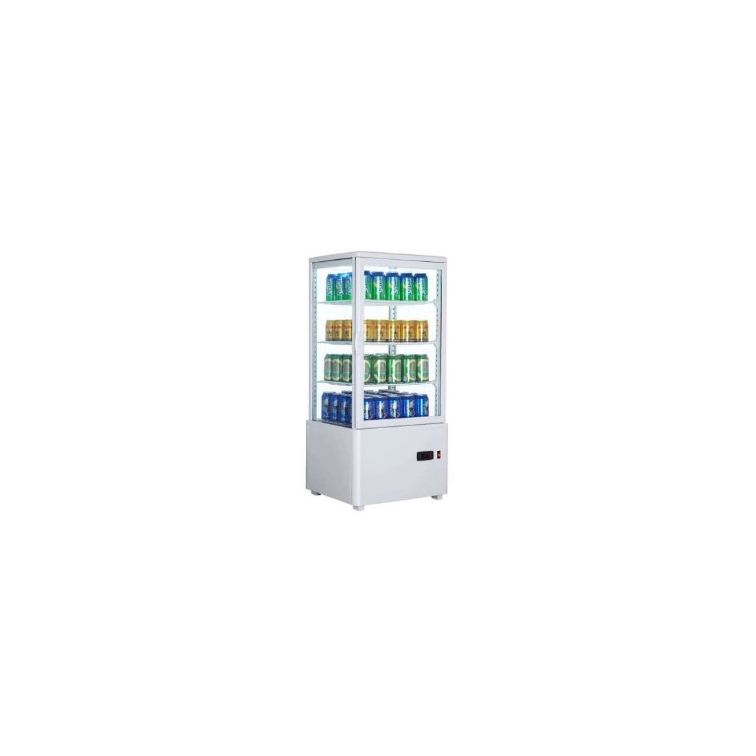 Vitrina expositora vertical a 4 caras de cristal. Equipada con termostato digital y desescarches automático. Tiene un rango de temperatura +0º/+12ºC. Incluye 3 estantes de serie. Medidas: 447 x 400 x 969 mm.