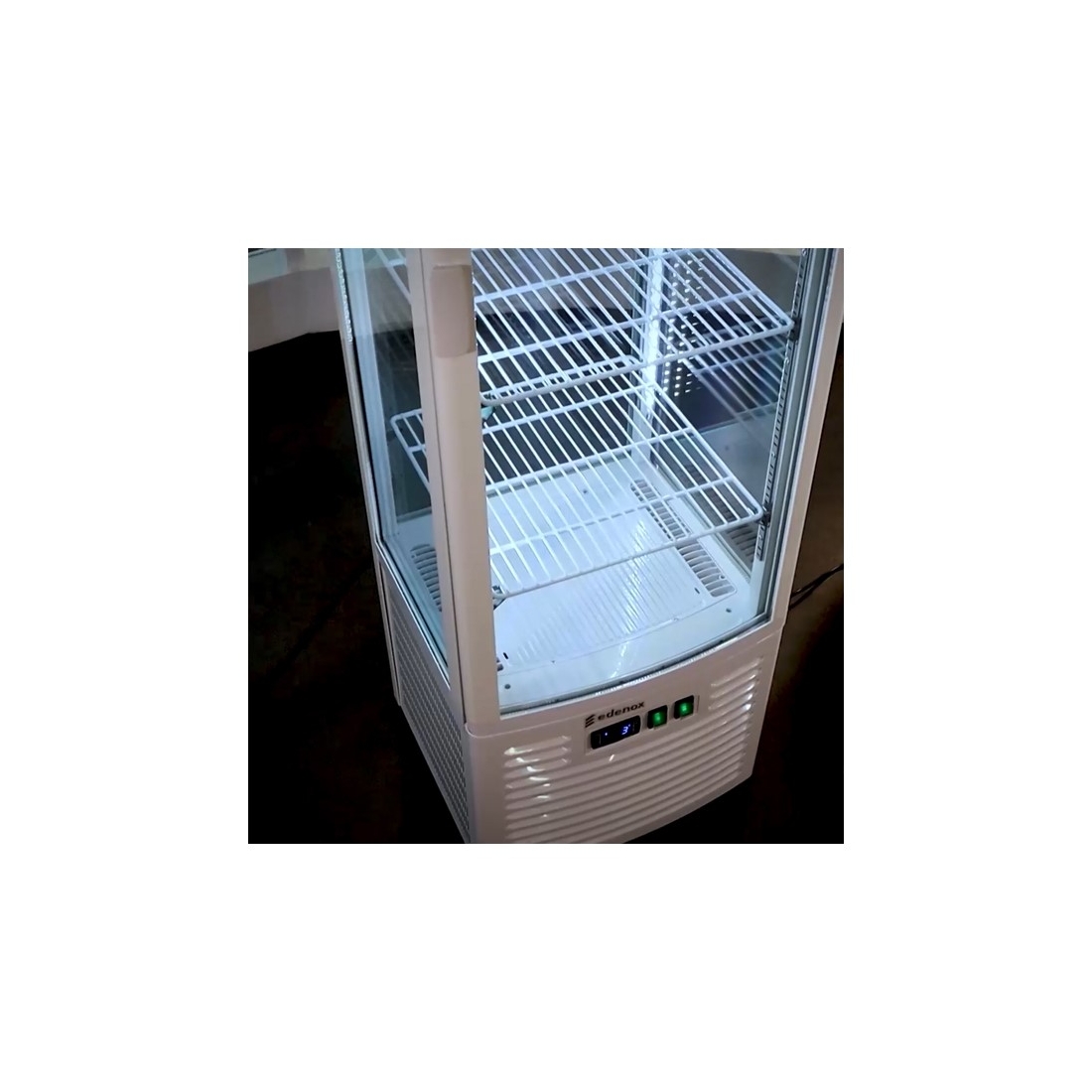 Vitrina Refrigerada Expositora VICO300HC de Edenox, con capacidad de 217 Litros. Visión panorámica del producto expuesto a través de sus 4 caras de cristal. Modelo de suelo.