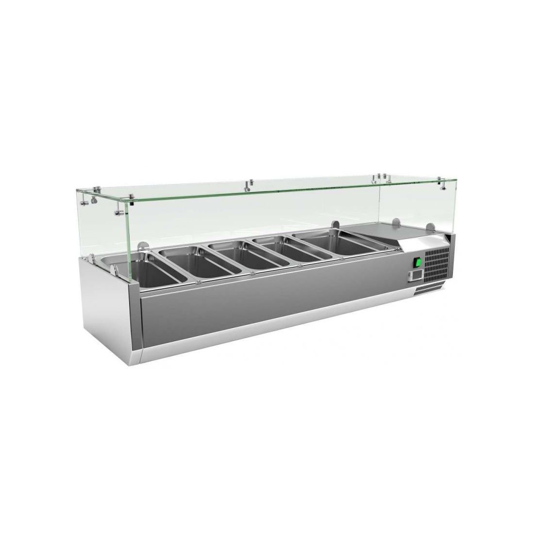 Expositor de ingredientes para colocar sobre mesa refrigerada, cuenta con capacidad de 4 cubetas GN 1/3 y 1cubeta 1/2. Mide 140cm de largo. Cuenta con cúpula de cristal para facilitar la visibilidad.