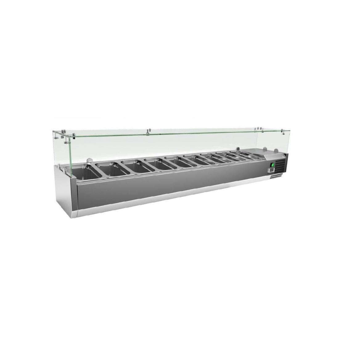 Expositor de ingredientes para colocar sobre mesa fría de preparación, cuenta con capacidad de 8 cubetas 1/4. Mide 180cm de largo. Cuenta con cúpula de cristal.