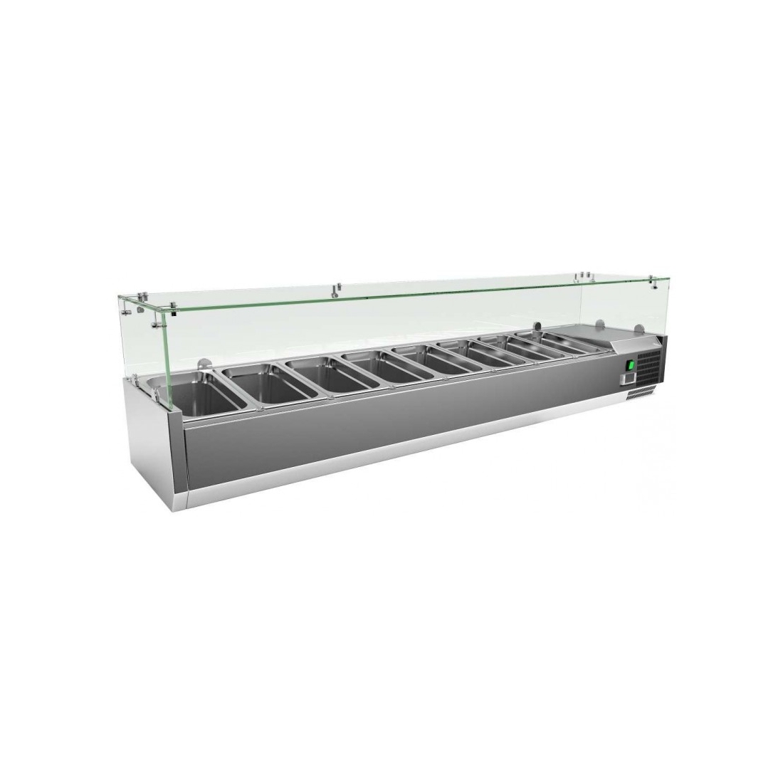 Expositor de ingredientes para colocar sobre mesa refrigerada, cuenta con capacidad de 9 cubetas GN 1/3. Mide 200cm de largo. Cuenta con cúpula de cristal para facilitar la visibilidad.