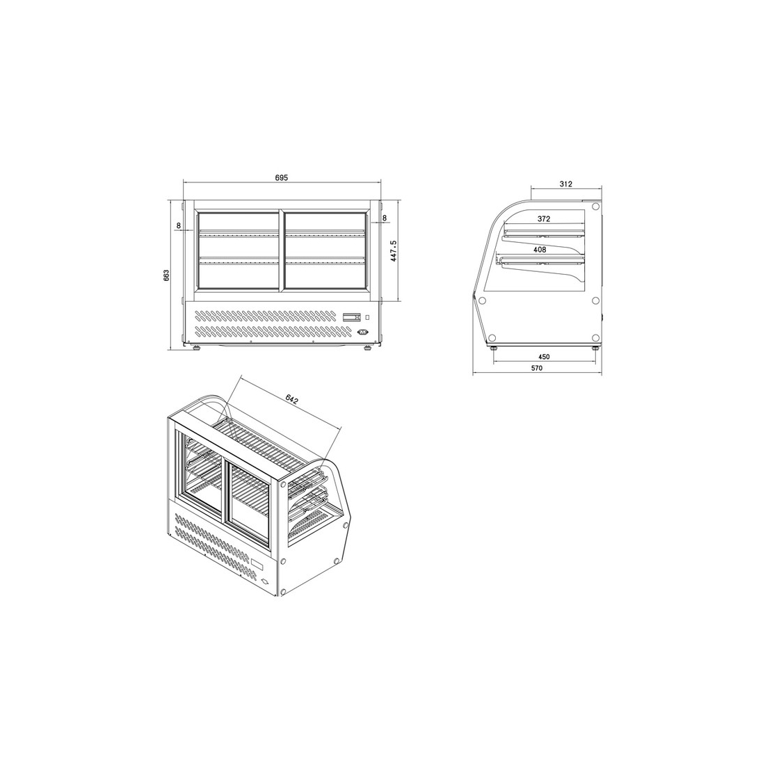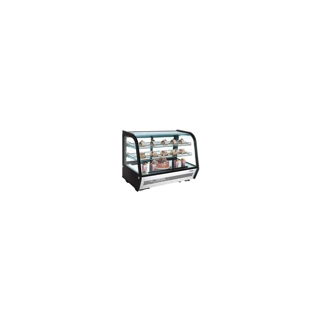 Vitrina expositora refrigerada de sobre mostrador. Modelo de refrigeración ventilada con 120 litros de capacidad. Sus dimensiones son: 700 x 575 x 676mm y cuenta con descongelación automática. Ideal para pasteles.