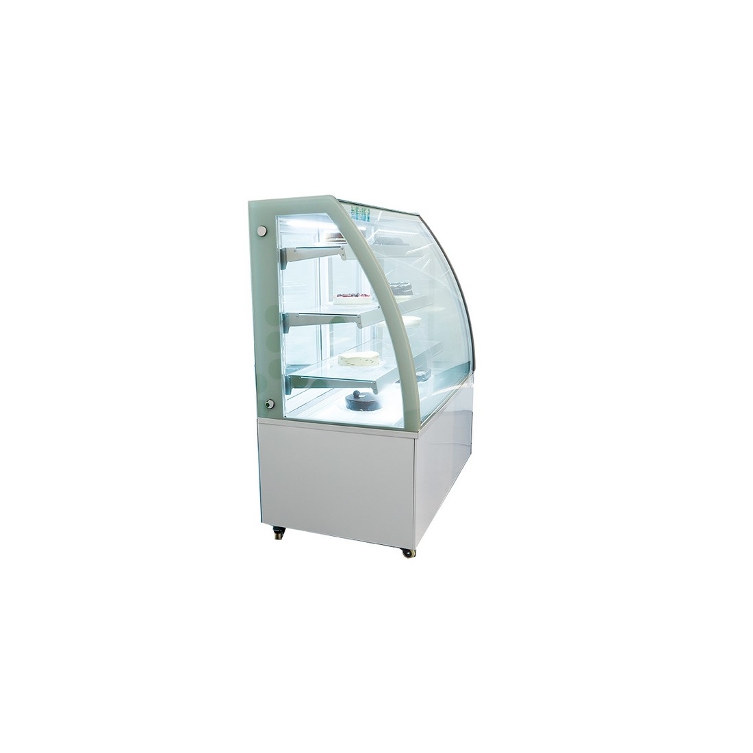 Vitrina Expositora refrigerada ideal para pastelerías. Modelo de 90cm, cuenta con refrigeración ventilada, puertas traseras correderas y rango de temperatura +2/+8ºC. Modelo de suelo con estética curva blanca.