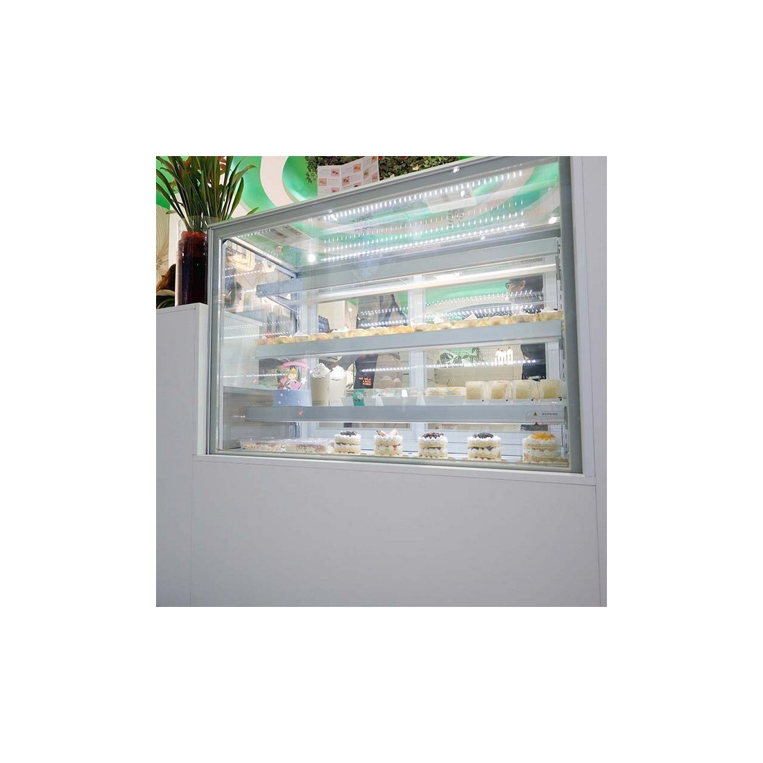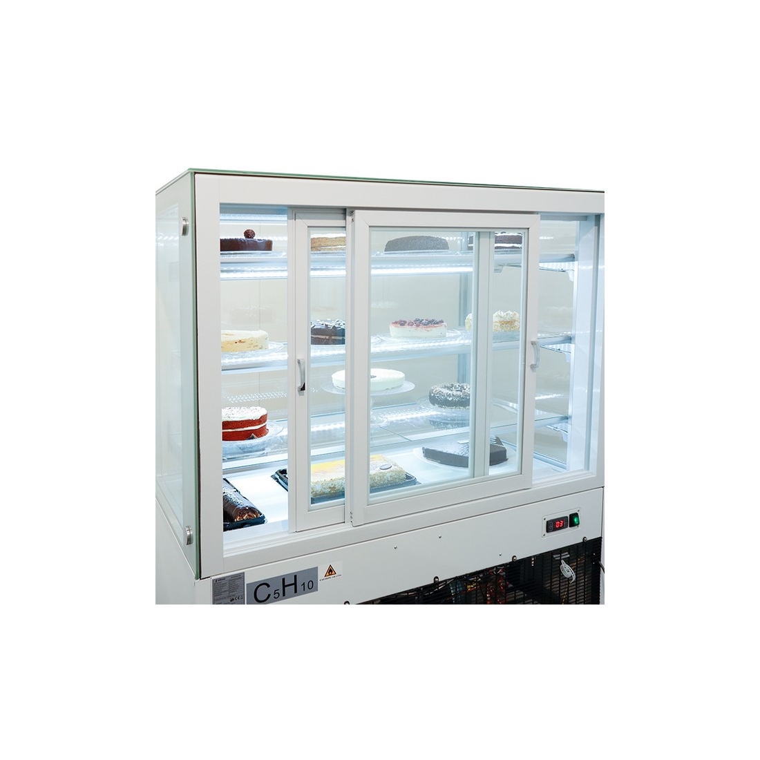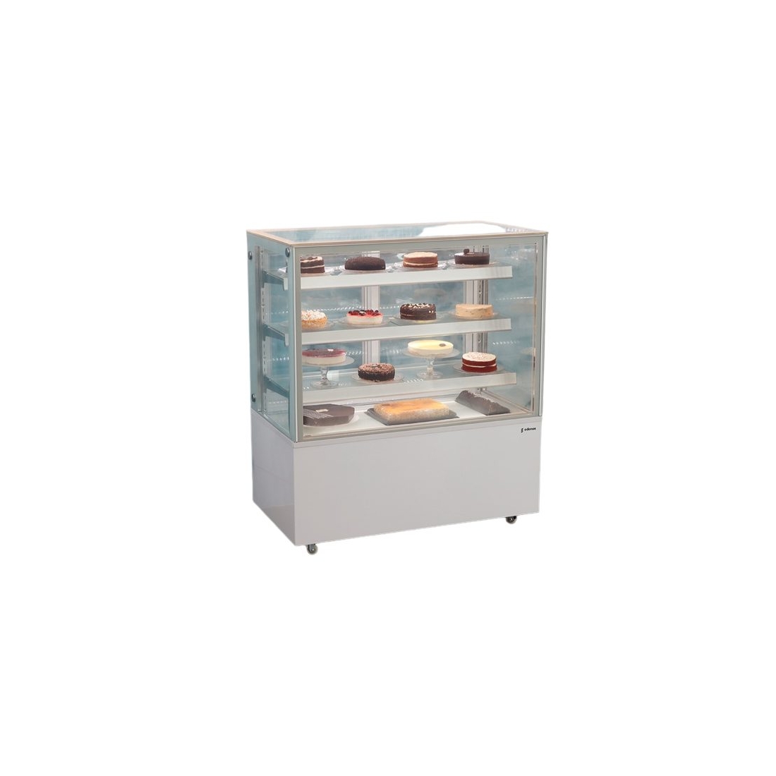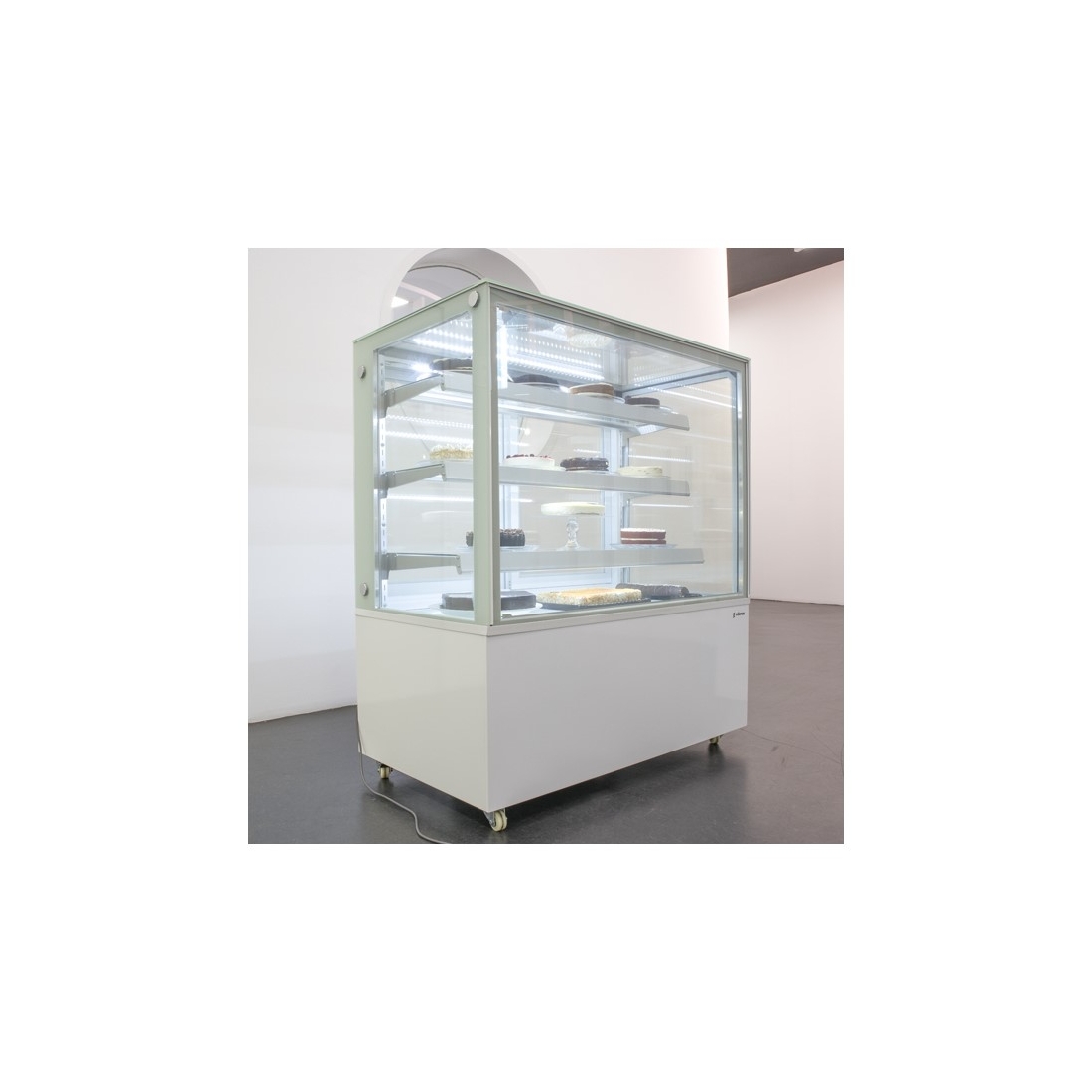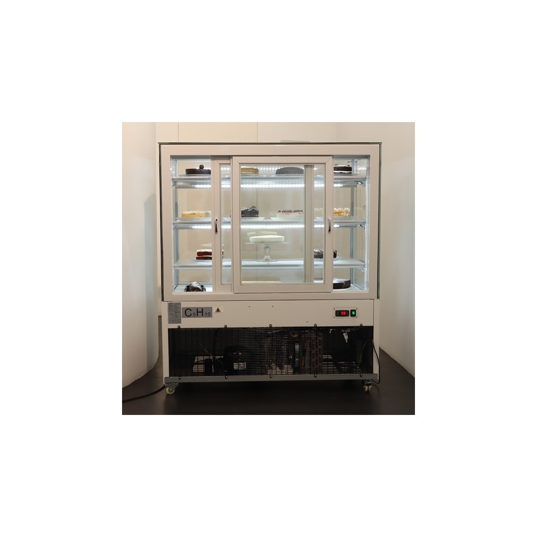 Vitrina Expositora refrigerada ideal para pastelerías. Modelo de 150cm, cuenta con refrigeración ventilada, puertas traseras correderas y rango de temperatura +2/+8ºC. Modelo de suelo con estética recta blanca.