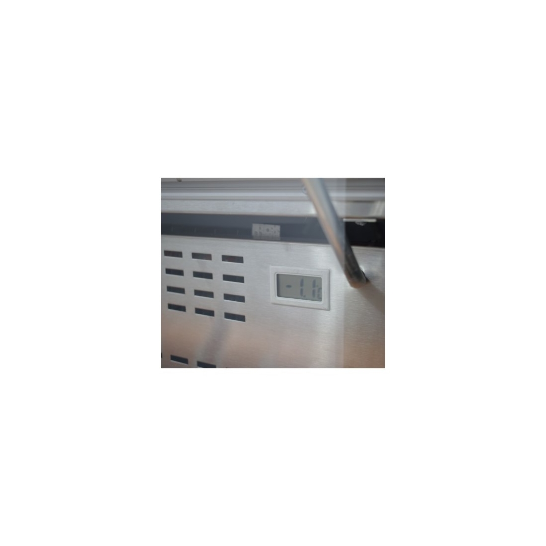 Mostrador frigorífico de diseño moderno con una amplia superficie de exposición, reserva refrigerada con 2 puertas, 2 estantes y doble evaporador estático. Destaca por su eficiencia energética, trabajando en un rango de temperatura de 0º-8ºC . Clase Climática 4. Medidas: 1500x973x1299h mm. De serie viene en color negro.